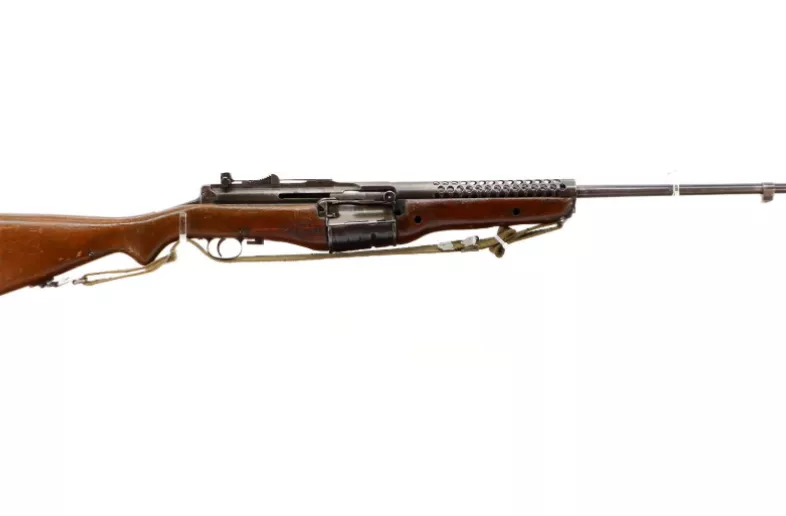 Main Description: Blade front sight with ears, adjustable rear peep sight, Parkerized metal finish, ventilated barrel shroud, smooth cocking handle, rotary magazine. Two piece refinished full military wood stocks, pistol grip, stock cracked and repaired, small chips behind receiver, checkered steel butt plate, sling swivels with green canvas US WWII sling, missing one pin in front of magazine, has bayonet lug.