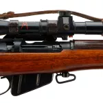Main Description: Manufactured by M47C BSA Shirley 1944, bolt, magazine and forearm match. Blade front sight with ears and ramp, adjustable milled rear peep sight, battle sight has been removed, blued metal finish, receiver has letter S on small flat by the receiver ring, letter T with Serifs by the ejector screw, TR on left side of butt socket, receiver drilled and tapped with two piece bases, cast steel mount with flat coil springs on mounting screws, mount Numbered L3372, rings match, has a Tel.Stg.No32 MK? (Marking under the rings), marked OS2039A, No25123 with red W and letter B in blue, clear optics single post with fine horizontal crosshair, has leather scope caps, elevation and windage knobs do not turn. Four piece full military wood stocks, grooved rear handguard, pistol grip, bottom stamped S51, wrist marked 20440, wood cheek rest with blued steel screws. One piece grey alloy butt plate with trap, has three sling swivels and bayonet lugs.