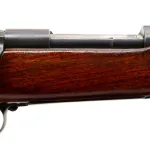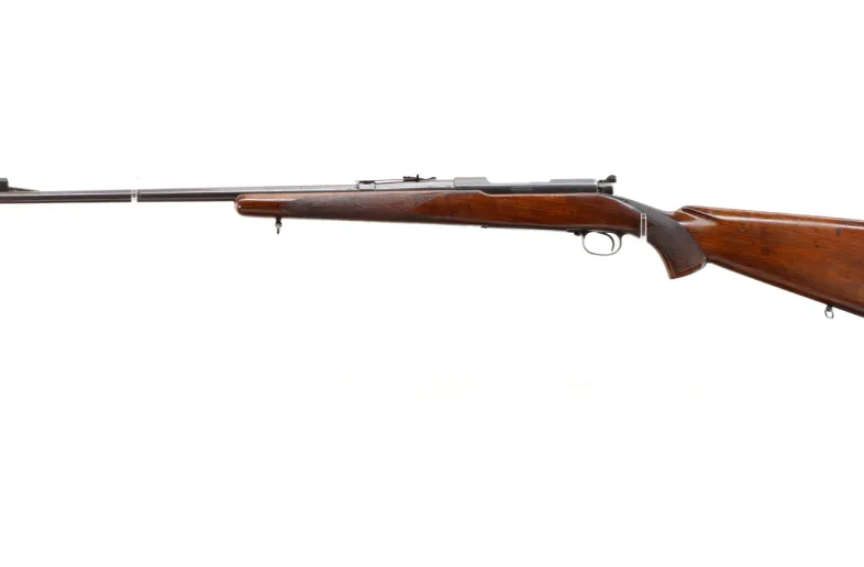 Main Description: Manufactured 1941. Blade front sight with hood and ramp, adjustable u notched rear sight, Satin Blued receiver, front ring drilled and tapped with plug screws installed, rear bridge has stripper clip guide, controlled round feed bolt with smooth knob. One piece wood stock, checkered forearm, pistol grip and steel butt plate, hinged floor plate, sling swivels.