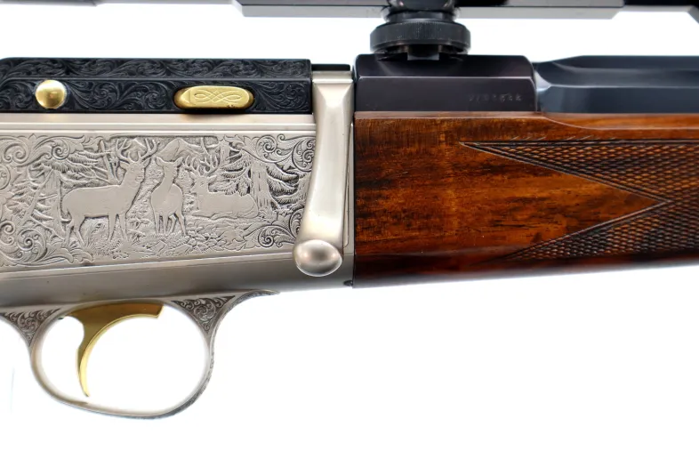 Main Description: Blade front sight with ramp, adjustable u notched rear sight, polish blued barrel with attached scope bases and Zeiss Diavari-Z 1.5-6x42 scope installed, clear optics three post reticle with fine lines , relief engraved silver receiver with game scenes, Satin black relief engraved bolt body with gold accents, Butter knife bolt handle. Two piece Satin finish wood stocks, checkered forearm and pistol grip, European cheek rest, Blaser logo black polymer butt plate, grip cap with brass medallion, sling swivels. Spare Barrel: .243 WIN, 23.25", Bore is Excellent, Blade front sight with ramp, adjustable u notched rear sight, polish blued finish, solid rib with scope bases and QD 1" rings, front sling swivels. Parts include: Complete .243 bolt assembly with Satin black carrier and black polymer magazine. Accessories include: 1" rings, rear ring has been disassembled.