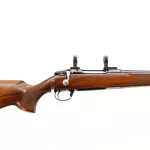 Main Description: Blade front sight with ramp, missing rear sight hole present, blued finish, receiver drilled and tapped with two piece 1" rings and bases installed, jewelled bolt, smooth knob. One piece wood stock, checkered forearm and pistol grip, cheek rest, grooved black polymer butt plate, both plate and stock broken at toe. Engraved trigger guard, sling swivels.