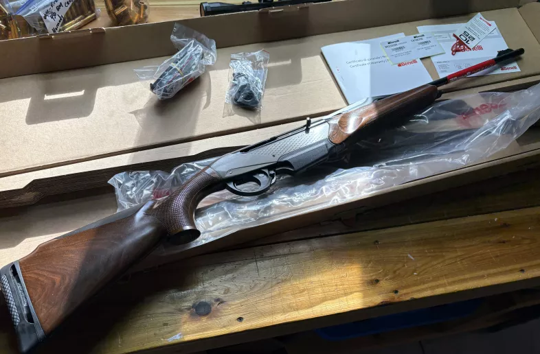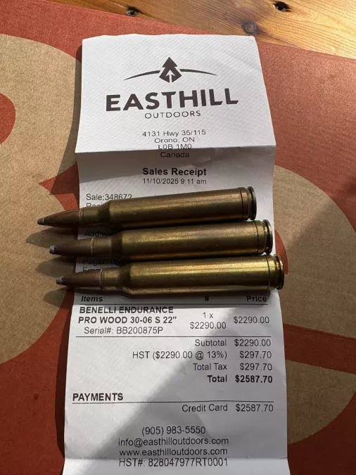 Brand new Benelli Endurance Pro, bought new Saturday Oct 11. This is the rifle that replaced the Argo E Pro. Exactly twenty rounds through it, enough to figure out it's not a good fit for me. Great shooter, nice trigger, low recoil. Absolutely nothing wrong with it. Easy to field strip. Progressive Comfort stock, Battue-style fibre optic iron sights (but factory drilled/tapped - takes Browning BAR mounts), Benelli auto-regulating gas system, threaded Crio 22" barrel, 5-round magazine, Benelli warranty. Comes with everything from the original purchase, save on the taxes and shipping, my loss is your gain.