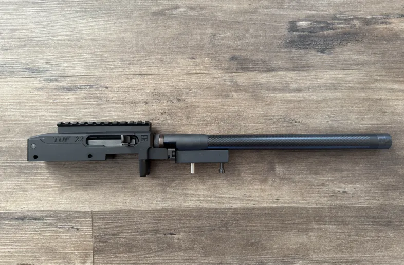 Selling my Dlask TUF-22 takedown receiver and 12.5” carbon fiber barrel. Neither have been shot with; just slowly upgraded a Ruger and have since swapped things to an x ring. Comes with a factory Ruger bolt assembly and charging handle. On top is the Dlask pic rail that I cut the over hang off of and painted as I like the look better. Holding that on are the 6 upgraded longer screws.