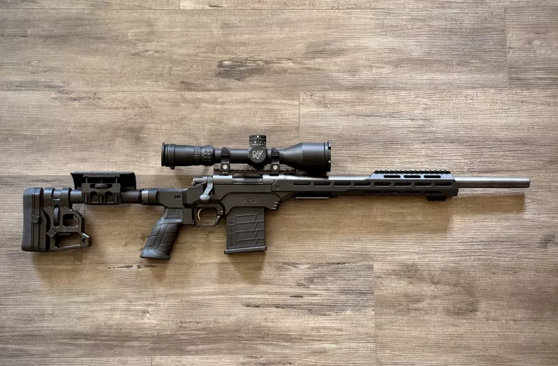 MDT LSS Gen 3 (tactical variant), MDT 20 moa scope base, MDT poly 10 round mag, MDT ARCA rail, Magpul pic rail, Nightforce NX8 2.5-20x50 Mil-XT in Nightforce ultralite rings.
