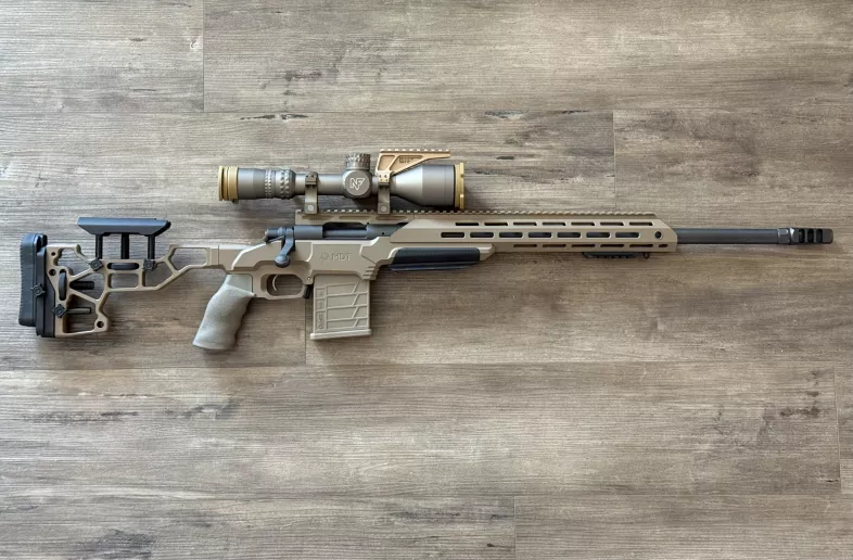 MDT ESS, MDT 20 moa scope base (ESS specific), MDT poly 10 round mag, MDT ARCA rail (ESS specific), Magpul pic rail, MDT muzzle brake, Ergo grip, Nightforce NX8 2.5-20x50 Mil-XT in Nightforce ultralite rings with a Reptilia diving board.