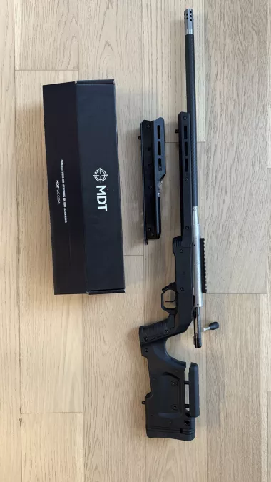 Custom Pristine Actions 223 Wylde RH with IBI Carbon Hunter barrel and Triggertech Special trigger in an MDT XRS Chassis in black (I also am including the matching ARCA forend for this chassis). Includes a ported IBI muzzle brake.