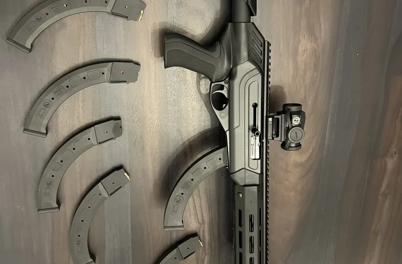 22lr. one of the last legal semi autos. 100 rounds through it. Six 25 round mags. Vortex spark solar. Weapon light not included