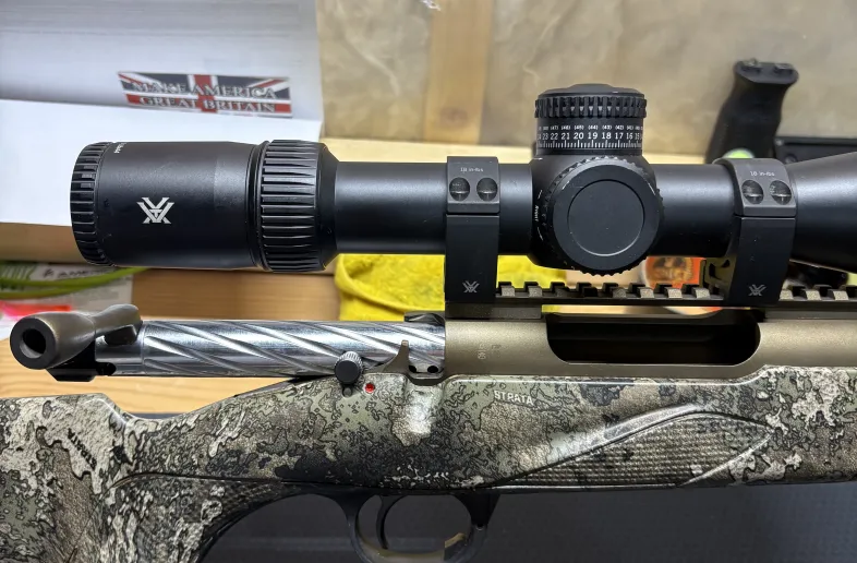 Rifle specs: 7.5#, 24" barrel, factory cerakote on receiver and barrel, truetimber strata camo stock, 1 piece receiver with pic rail, adjustable trigger, fluted chrome bolt with 60 degree throw, 5/8x24 threaded muzzle (comes with radial brake and thread protector), 7 year factory warranty and factory guaranteed sub-moa performance, standard sling stud / mounting points.