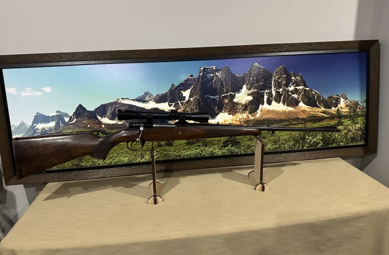 Bolt is jewelled, silver finish. swept back, style bolt safety-right side push button Aluminum - Engraved -drop style Floorplate - inside trigger guard button Trigger - Serrated