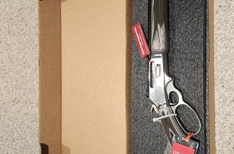 New in box 1895 SBL, polished stainless with big loop and grey laminated stock. Chambered in 45-70.