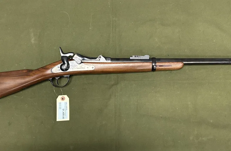 Perdersoli Springfield trapdoor carbine chambered in 40-70 Government with a 22” barrel in excellent condition. Bore is shiny