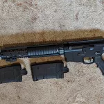 cleaning up the safe, sliming down the collection, up today is my Knights Armament MK11 MOD 0 Match clone build. prior to the May 2020 ban, I had built 2 308win rifles, an M110SASS, and this MK11Mod0 Match, the M110SASS was sold off long ago sadly, and now its time to sell off what I can of this rifle. there are a few parts I never did acquire for it, namely the Gasblock. but its rocking as much as everything else it can be for being parted onto an MDI NRR (to remain Non-restricted) 24" 308Win Match Recessed crown 1:10t barrel, KAC Semi Adjustable DMR trigger, KAC Ambi Safety Selector, KAC\LMT Bolt catch, KAC Free float RAS Rail , x3 KAC 11rib rail panels, KAC picrail Stud bipod adapter, A2 Buttstock & pistol grip & 2 5\20 Pmags. I wasnt super serial about making sure i have the utmost in correctness (1:10t over 1:11.25t) stuff like that. this is a Brand new made barrel (Kac EMR profile) the Tape over the gas Journal is purely just to keep the journal scratch free, it has No hole at this moment in time
