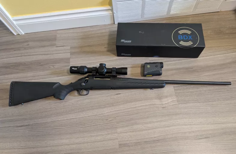 I have a Ruger American chambered in 30-06. The scope is a 2.5x - 8x Sig Sauer Sierra BDX with a Range finder. BDX is pretty cool that it can link your range finder data to the scope instantly to give you a illuminated dot firing hold. The app on your phone also links to the scope and you can customize the cartridge ballistics data to further fine tune the system. This BDX model can also be used for archery. Hes been sighted in for 200 yards as per the 180grain Hornaday whitetail rounds I am using. The rifle is in mint condition. Less than a couple hundred rounds through it. Comes with one magazine and box from BDX system. I am selling my hunting rifle as I got something new.