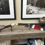 Here is a unique combination for somebody that would like to display their commemorative rifle. The rifle itself comes new with the box and all the marketing materials that were included with Winchester when purchased new. I have paired it up with the identical oak presentation case with red velvet lining for the Texas commemorative with Western Bowie matching knife with leather sheath. Anyone looking for an amazing presentation this is your package.