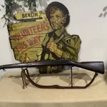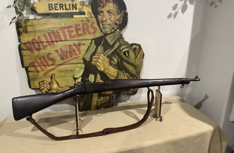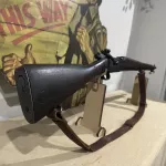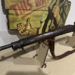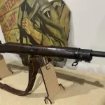 Cal. 30-06. Serial# 4798918. Bbl.24". Marked behind front sight "SC" with a flaming bomb and "10-43." Aperture rear sight graduated to 800 yards. Blade front sight. Swept bolt marked on top of handle "B2" and marking underneath appears as "F." Safety lug is Remington style, as is the bolt shroud. All stamped furniture, including large bow triggerguard and fine checkered trap buttplate. Walnut stock set with two recoil bolts. The grip is marked underneath with encircled "P" proof. Assembly marks are visible ahead of the trigger guard. CONDITION: stock set has a and bruises in its appearance commensurate with extensive service. There are numerous handling marks. The metal retains its original finish with some thinning and wear. Very good, shiny 4-groove bore.