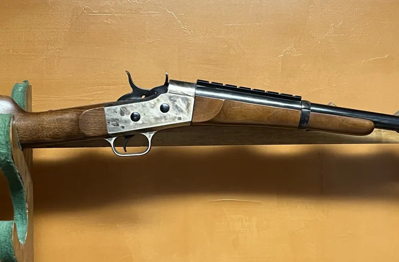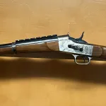 Pedersoli rolling block in 45LC. 20 inch barrel. Wood has a few safe kisses . Metal is like new with great case color on receiver and barrel band and but plate.