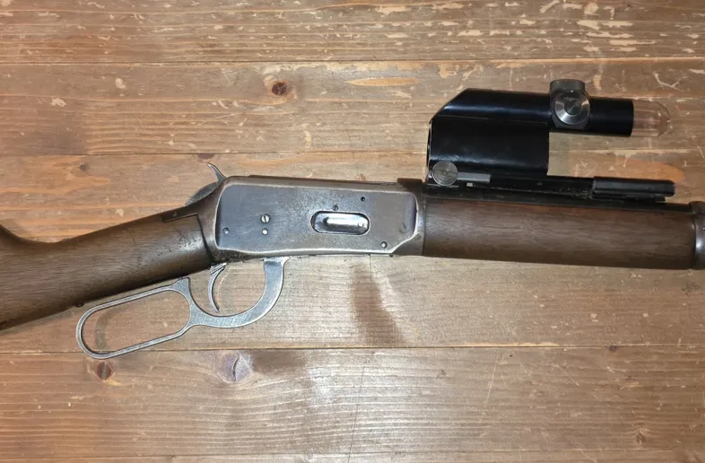 Functional model 94 with old weaver quick point red dot. Wood is in decent shape, no noticeable cracks.