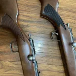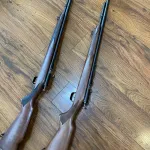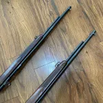 Here is a pair of identical Cooey 600 repeaters both of which are in mint condition.Neither .. have fired more than 5 rounds, Buy one for $400. or both for $700. Bluing is mint on both, as is the condition of the Walnut wood. These were produced at the Former Cooey Coburg Ontario factory and are likely from the final production period around late 1960's. Sling swivels, white butt trims, checkered walnut stocks, Adjustable steel rear sights, plus steel front sights, receivers are grooved for scope mounting, Bores are mint, bluing is 99%, one stock has a small dent in the fore grip area, trigger guards are steel not plastic, includes one original factory shipping carton matched to the gun serial #.