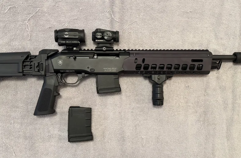AKDAS Alcor 223 rifle with Crusader Arms Tactical conversion kit. This is a non-restricted rifle and comes with original hunting rifle parts for reverse conversion. It has less than 100 rounds through it. 18.5 inch barrel with gas piston system. Comes with 2x5 round mags. Will take any AR mags as well, however Pmags Gen 3 and Cross Mags work best. Faux suppressor included. Optic and Magnifier and vertical forward handle not included. Comes with AKDAS range bag. NO trades. Shipping not included. Please feel free to check my reviews. Thanks for viewing.