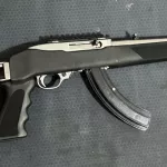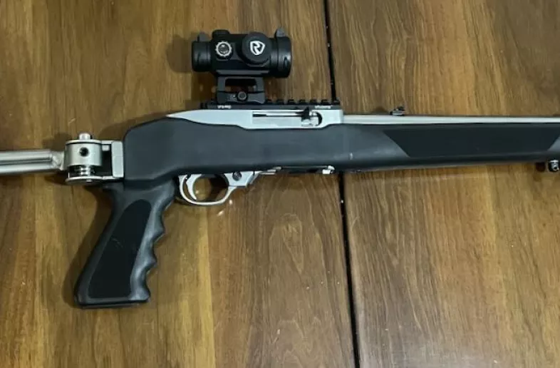 Stainless steel Ruger 10/22 carbine (18.5" barrel) in Butler Creek folding stock. This stock is discontinued so it not so easy to find.