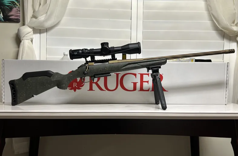 Ruger American GEN2 Predator in splatter ODG with 22” cold hammer-forged golden spiral fluted barrel and a muzzle brake.