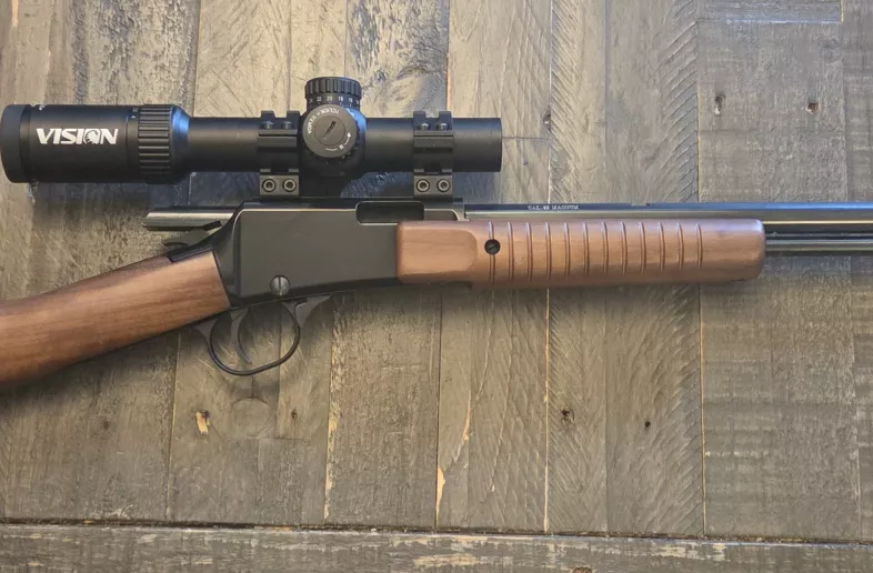 New condition, Henry 22 Mag Pump with a mounted Scorpion Outdoors Vision 1-4x24 IR 30mm Scope, and 150 rounds of 22wmr.