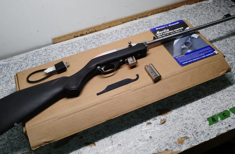 BNIB Marlin Papoose Take Down semi auto in 22lr with synthetic stock. I bought this new many years ago, comes with an extra 7 shot ss clip. Mint ! These dont come around very often !