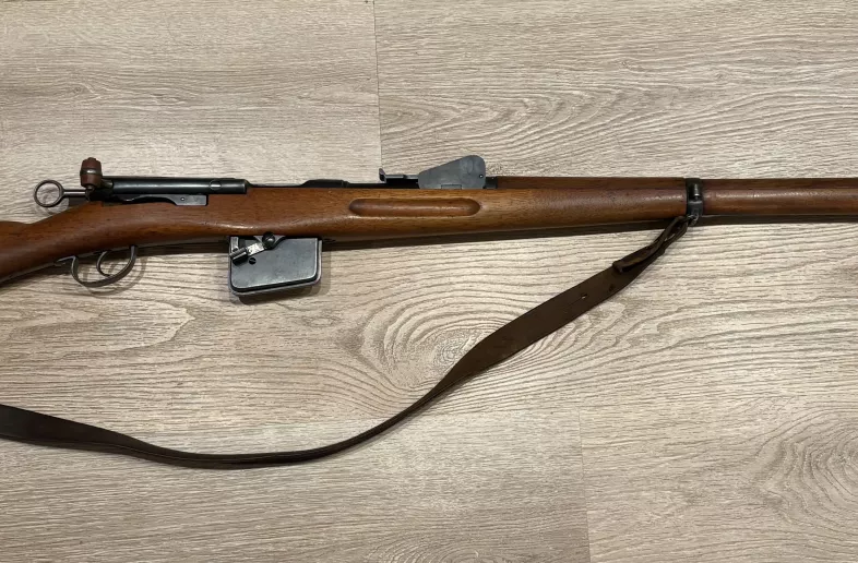 Schmidt Rubin 1889 in great condition. No cracks, wood is in very good shape, shiny bore, no pitting, leather sling and muzzle cover included. Numbers matching. Great for a collector.