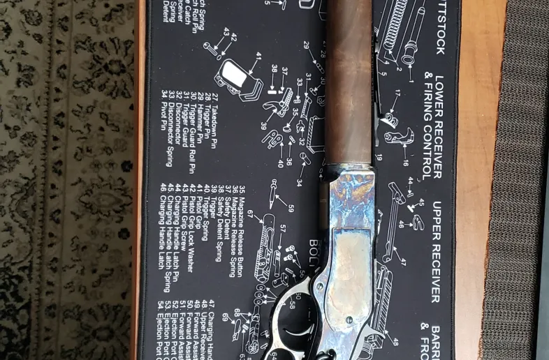 - FEATURES – Top tang is drilled and tapped for optional peep sight; Side plates, receiver, lever, barrel band and buttplate are color case hardened