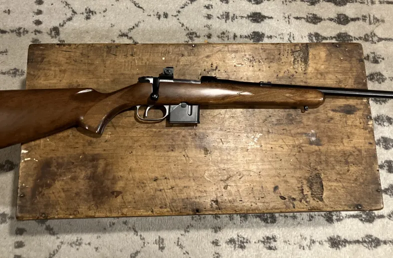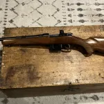 The front sight is taller to work with peep sight, Action is nice and tight and smooth bolt action. Barrel and receiver are in great shape, wood stock has some marks from a ring ect and some dings on the one side of buttstock