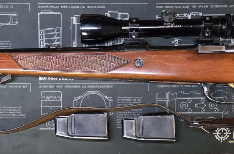 Parker Hale Magnum in 300 Win Mag. This is the model with the drop magazine. Comes with 2 magazines. Bushnell Scopechief IV 3-9. Recoil pad could use replaced, otherwise in decent condition. Comes with front and rear iron sights as well. 24" Barrel.