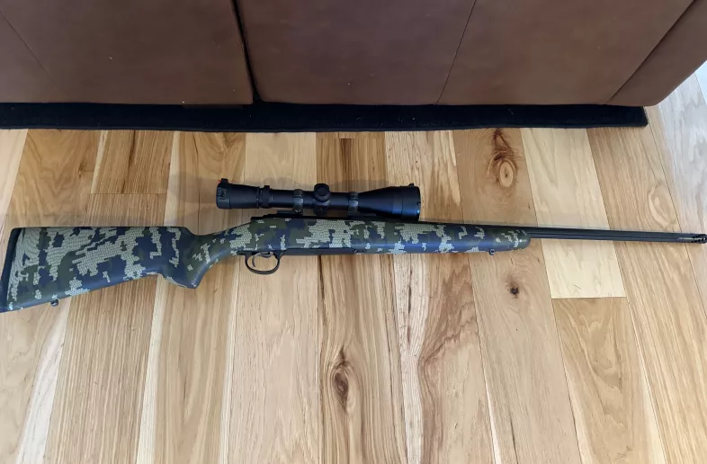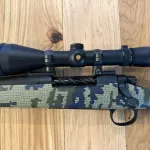7mm Rem Mag, Barrel cut to 24” fluted with muzzle break installed, action slabbed and bolt helical fluted. Cerakote graphite black, Wildcat composite carbon fibre stock and dipped in Kuiu Verde. Scope is a Leupold Vx-3 4.5-14x50mm long range selling as a package.