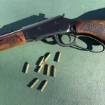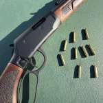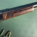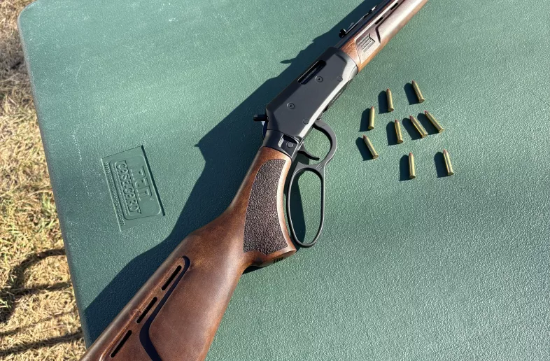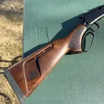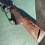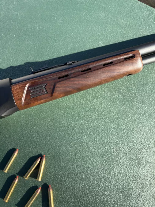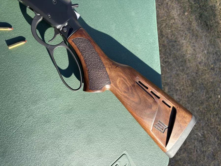 This lever action rifle has gorgeous Turkish Walnut furniture, an 18" medium contour threaded and capped barrel, adjustable front and rear rifle sights, holds nine rounds of 22 WMR, a pistol grip stippled butt-stock & fore-stock, a cross-bolt safety, a very nice medium loop lever, and has the take-down feature for easy cleaning, transportation, and storage.
