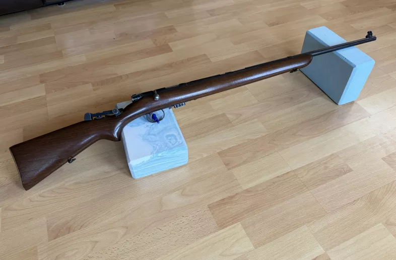 BSA War Office Pattern Mini. This is a rare and beautiful little rifle. It is the repeater version, and was missing the mag floor plate when I acquired it. I made one and the mag functions flawlessly now. Rifle shoots very well. It has a BSA vernier tang sight on it as well which was a factory option. It’s in 22LR. A very cool little trainer!