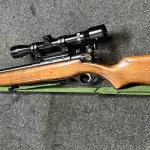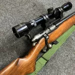 For sale is an interesting training rifle from WW2. Made by Mossberg and sold to the British to keep up with training rifle demand. This model has a 7 round detachable box magazine and features peep sights. This particular rifle is marked with an "N broad arrow" indicating Naval use. A Tasco 4-32 scope is mounted to a rail, but it can be easily removed for use with the iron sights. Comes with a repro M1 sling and the factory dust cover. I just don't use it as much anymore now that I have a CZ457.