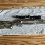 Browning A Bolt Stainless Steel with muzzle brake on a new Boyd's laminated wood stock. Bausch and Lomb 3x9 rifle scope.