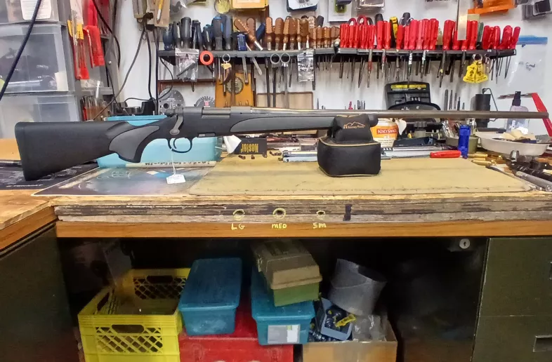 REM 700, 22-250, black oxide finish action, DM, SPS stock poorly Glassbedded, REM 26" CM steel bbl, maybe #3 contour with what looks like a poor cold blue finish, 1-14 twist( measured it), rifling very good, throat wear is nil, (borescoped with "Hawkeye"), will ream and set back to chamber of your choice for $300 if bought. Took in on trade and have not test fired yet.
