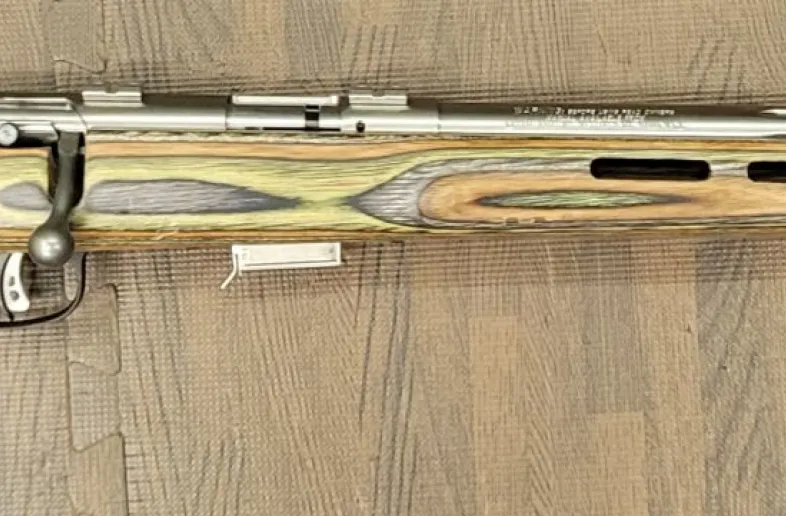 Savage 93R17 in 17 HMR. Not sure about the exact trim but it's got the heavy, fluted, stainless barrel.