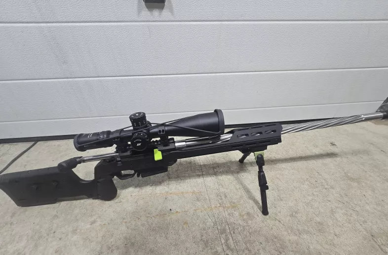 It has a DNT The One optic 7-35x56, MDT GRND pod, and a EC tuner brake. It has a MDT 20MOA pic rail.