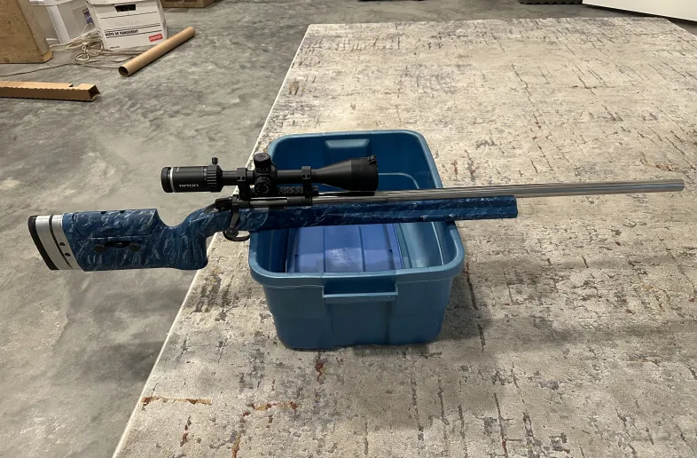 Chambered in 308 sitting in a bedded Synthetic Blue MacMillan older style Kestros stock with a 29” Bartlien 1-10 twist barrel with 840 rounds on it