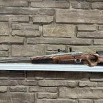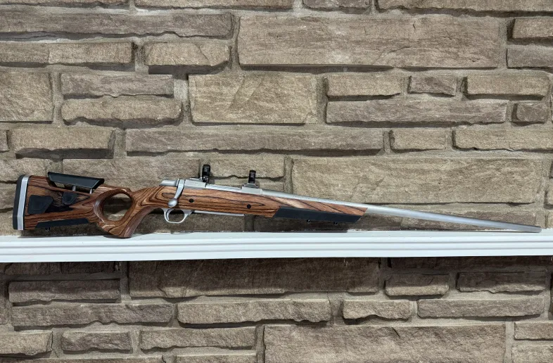 Metal swing down mag, stainless receiver and barrel set into a Boyd’s Laminate At - One adjustable stock. Comes with rings / bases