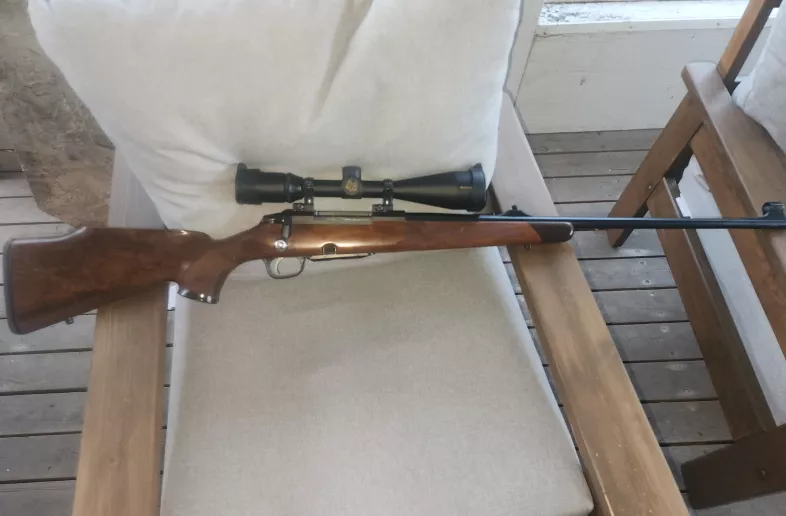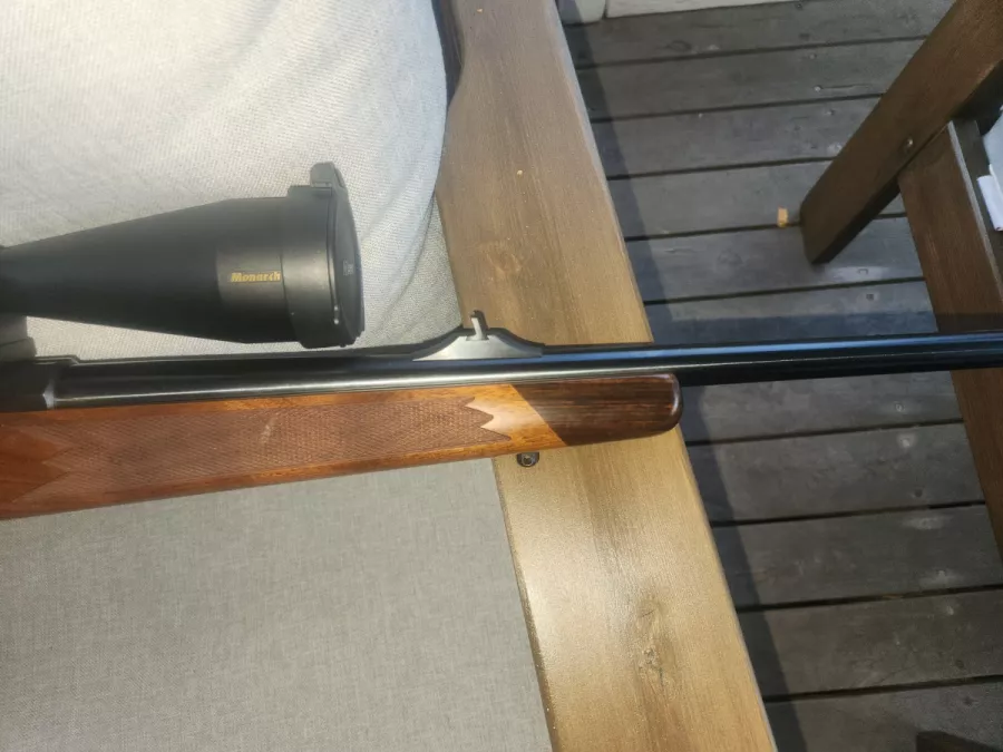 Tikka model 695 in 300 win mag, has open sights and a detachable magazine, excellent condition, exceptionally well figured walnut stock, has optilock rings..will sell with the 2.5-10x42 Nikon Monarch for 1750$or 1400$ without scope ..rings stay on it either way