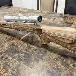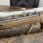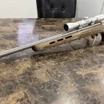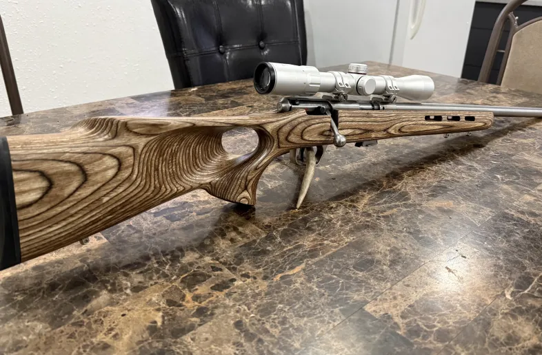 Savage mark 2 22 LR stainless heavy barrel mounted with a matching Simmons 3-9-40 scope. Beautiful thumb hole wood stock a really comfortable fun shooting toy asking 800$ can ship anywhere in Canada on your expense