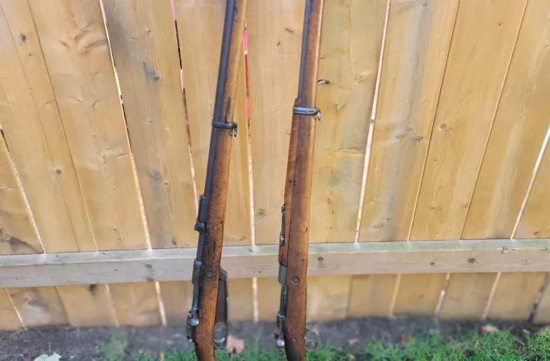 Both rifles chambered in 8mm Mauser – historically matched and display well together.