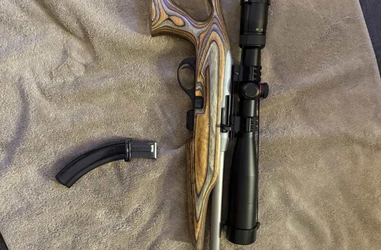 Beautiful Remington 597 target model with Simmons 4.5x18 scope. This thing is very very accurate and a lot of fun in semi-automatic. Super clean gun, no marks no scuffs, like new condition. 2 mags with it, 1 10 round and 1 25 round. Ask for more details, make me an offer