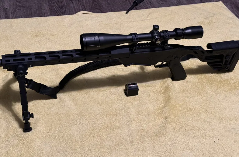 Beautiful Ruger precision 22 with sling and 10 round Ruger mag. Also comes with bsa 22 sweet bipod and rings. The bsa 22 sweet has a 22 yardage calculator that when you set the yardage, it calculates drop at that amount of yards. Things things accurate out to 200 yards. One of a kind build. You won’t be disappointed with this thing. Msg for more details.
