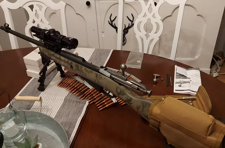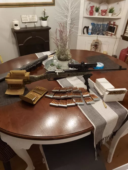 Shortened Mosin-Nagant with pistol scope and bipod. 100+ rounds as well.