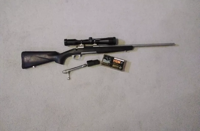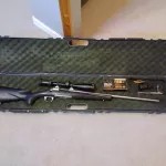 Browning stainless stalker, 243 with less than 100 rounds fired, 4.5x14 Zeiss scope, box of Berger ammo, hard case, shooting sticks.