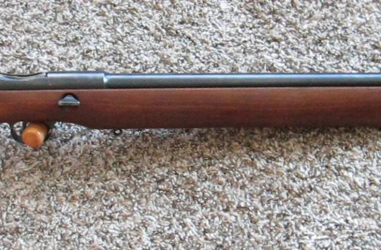 It has competion-type fore and rear sights. Overall it is in good to excellent shape. The only thing of note is that at some point a previous owner drilled a line of holes underneath the forestock, which have been filled. The images give an idea of the overall condition of the rifle.
