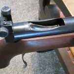 This is a .22 competition target Vickers rifle made in the 1930s, some time between 1934 and 1939. It is a 44 1/2" long, quite heavy beast with the Vickers signature 'relieved' barrel-to-fore stock mounting, apparently to enhance the accuracy. It utilises the narrow, falling block, Martini-type action. The bore is bright and shiney, with crisp rifling.